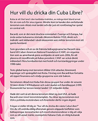 Det är viktigt att sprida kunskap om Bacardis stöd till fascism, terrorism och diktatur. Bojkotta Bacardi!