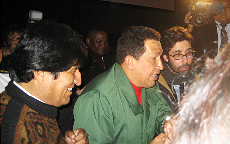 Men när talet tog slut gjorde jublet inte detsamma. Till slut gjorde de två presidenterna som popstjärnor och hoppade ner från scenen och gick fram till staketet som skiljde dem från oss. Ner från podiet kom med dem massor av säkerhetsfolk av olika slag, egna vakter, danska byggarbetare och några vilsna danska poliser. Vakterna verkade måttligt förtjusta, men maktlösa, över att Hugo och Evo nu långsamt gick längs med hela det långa staketet, hälsade, skakade hand och pratade med oss som stod längst fram. Och de tog god tid på sig. Trots att danska drottningen hade galamiddag denna kväll för alla statschefer.