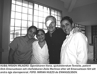 Latinamerikareportern Dick Emanuelsson fick sina ögon opererade av kubanska läkare i Honduras. Han skriver om sina medpatienter, mycket fattiga honduraner som ”tackar Gud och Fidel för att jag nu verkligen lever, för kubanernas änglahänder gav mig liv”! Så säger 25-åriga Eddie som föddes med starr. Misión Milagro, Mirakelmissionen drog igång i december 2004 som kanske ett av de finaste och mest humana sjukvårdsprogram världen skådat. De kubanska ögonkirurgerna tog sig först an synskadade och blinda i Venezuela för att sedan sprida sig över hela Latinamerika och Karibien. Över 1,5 miljon människor har återfått sin syn.