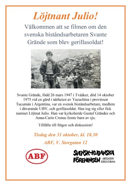 2023-10-31 Jönköping. Filmkväll, "Löjtnant Julio"![]() Välkommen på filmkväll! Vi visar: Löjtnant Julio! Om den svenske biståndsarbetaren Svante Grände som blev gerillasoldat. Tisdag 31 oktober, 18.30 ABF, Västra Storgatan 12, Jönköping För affisch i pdf se här: Löjtnat Julio 1 |