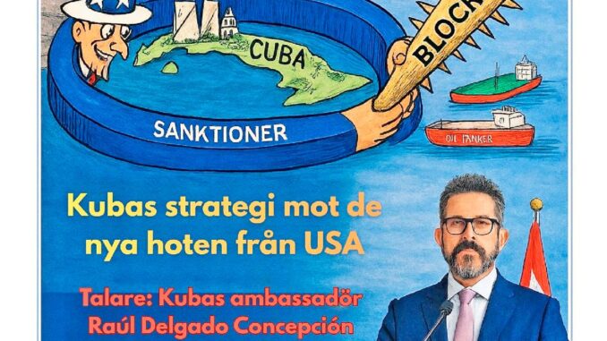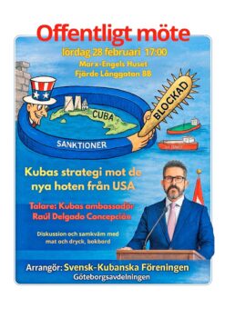 2026-02-28 Göteborg. Möte med Kubas ambassadör om Kubas strategi 2025-12-07 Zoltan T På gång 0 KUBAS STRATEGI MOT DE NYA HOTEN FRÅN USA Talare: Kubas ambassadör Raíl Delgado Concepción Diskussion och samkväm. Mat och dryck. Bokbord. Lördag 28 februari kl.17.00 Marx Engelshuset, Fjärde Långgatan 8B Välkomna!