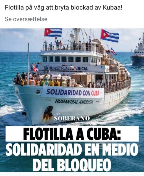 Flottiljen Nuestra America avseglar inom kort!![]() Flottiljen Nuestra America avseglar inom kort! Codepink och Progressive International är två av många organisationer som står bakom Nuestra America (Vårt Amerika)- flottiljen till Kuba. Den avseglar inom kort mot Havanna. Syftet är att fästa omvärldens uppmärksamhet på utsvältningen av tio miljoner kubaner och samtidigt ha med sig mediciner och annat material som Kuba hindras köpa. ![]() Vi seglar till Kuba för att leverera livsviktig humanitär hjälp till dess befolkning. Trump-administrationen stryper ön genom att stoppa leveranser av bränsle, flyg och livsviktiga förnödenheter. Konsekvenserna är dödliga för nyfödda och föräldrar, för äldre och sjuka. Därför lanserar vi Nuestra América Flotilla, som seglar över Karibiska havet i solidaritet med det kubanska folket. Och vi ber om ert stöd för att hjälpa oss att förbereda uppdraget och köpa in mat och medicin som vi ska ta med till det kubanska folket. Tillsammans kan vi bryta belägringen, rädda liv och stå upp för Kubas självbestämmande. Gå med oss när vi samlar människor från hela världen och förbereder oss för avfärd. ![]() https://act.progressive.international/flotilla/ https://www.codepink.org/convergecuba ![]() BRYT BLOCKADEN AV KUBA! Bli en del av solidaritetsrörelsen! Bli medlem i Svensk-Kubanska! Eller skicka ett bidrag till Stödfonden! Ange namn, e-post, adress och skicka 300 kr för ett års medlemskap (150 för pensionärer, arbetslösa och studerande) Swish 123 589 0975 eller Pg 40 54 11 – 0 Bidrag till insamlingen ”Mediciner till Kuba” PG 23 57 15 – 0 ELLER Swish 123 182 37 72 |