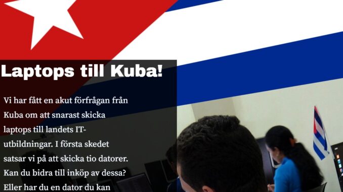Svensk-Kubanska Föreningen har fått en förfrågan från Kuba om möjligheten att skicka bärbara datorer, laptops och mobiltelefoner till landets IT-utbildningar. Det gäller såväl nya som begagnade.
