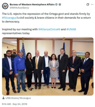 USA:s utrikesdepartement träffar de högerorienterade oligarker som ledde det misslyckade kuppförsöket i Nicaragua 2018, däribland Juan Sebastián Chamorro och Félix Maradiaga.