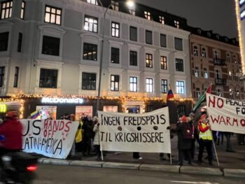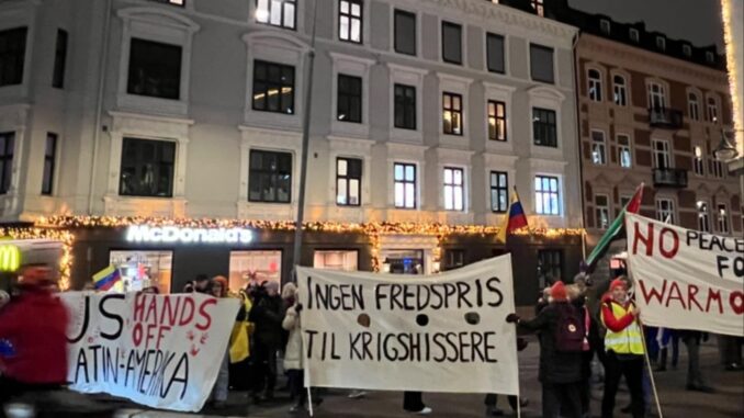 Protester utanför Nobelcentret i Oslo, 9 december 2025