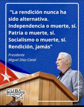 Nej, ni herrar som sysslar med manipulation och lögner, Kuba är inte en misslyckad stat; Kuba är en belägrad stat, Kuba är en stat som står inför en mångdimensionell aggression: ekonomisk krigföring, en intensifierad blockad och en energiblockad. Kuba är en hotad stat som inte ger upp! Och trots allt, och tack vare socialismen, är Kuba en stat som gör motstånd, skapar och – missta er inte – en stat som kommer att segra!