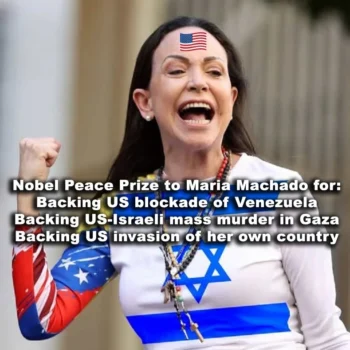 Dagens pristagare är Maria Corina Machado. Bortsett ifrån hennes mänskliga rättighetsaktivism i sitt hemland är hennes framträdande meriter stöd till Israels folkmord i Gaza, stöd till USAs mördande av venezuelanska fiskare och upprepad begäran om militär invasion av Venezuela för att avsätta (förmodligen döda) den folkvalda regeringen där – ett uttryck för hennes splittrande hets i sitt eget land.