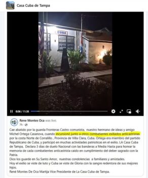 De föll för den Castrokommunistiska kubanska kustbevakningen, vår broder i idéer och vår vän Michel Ortega Casanova, när han tillsammans med andra anti-castristiska exilkämpar trängde in  på kusten Norte de Corrarillo, provinsen Santa Clara, Kuba. Ortega var medlem i det Kubanska Republikanska Partiet och deltog i många patriotiska aktiviteter i exilen. Casa Cuba de Tampa förklarar tre dagars nationell sorg med fanan på halv stång för att hylla minnet av var och en av de anti-castristiska kämparna som föll i det helgade uppdraget för Fäderneslandet.