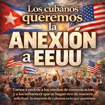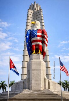 Kubaner i USA som vill ansluta ön till stormakten: ”Kubanerna vill ha annektering till USA. Vi ska be medier och influencers att de återger vårt krav som majoriteten av kubanerna vill ha.” Till höger, annektionisternas dröm, Revolutionsplatsen i Havanna och José Martí ersatt med USAs gam.