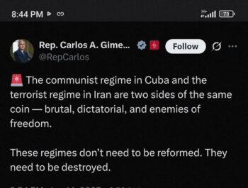Representant Carlos Gimenez (R-FL), en kubansk-amerikansk hök [asgam?], upprepade hans ord på X på måndagen: ”Det som just har hänt i Iran… är en varning för alla diktaturer som tror att makten varar för evigt… Kuba står på tur.”